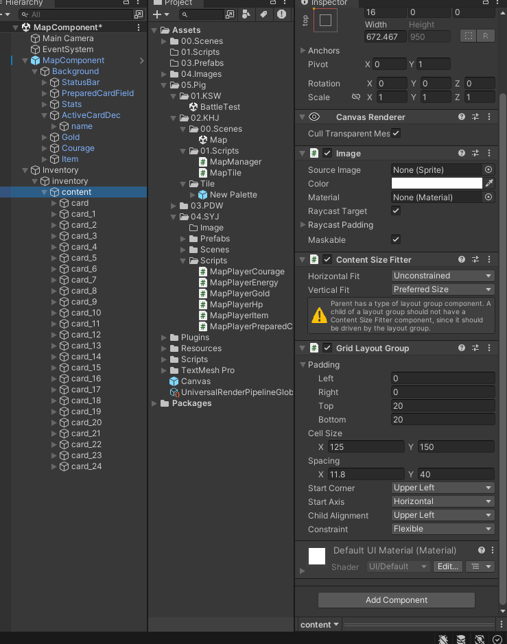 6. Content에 Content Size Fitter, Grid Layout Group 컴포넌트 추가