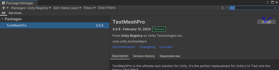 패키지매니저를 열고 TextMeshPro를 설치하면 에러 2줄이 해결된다.