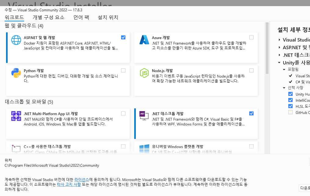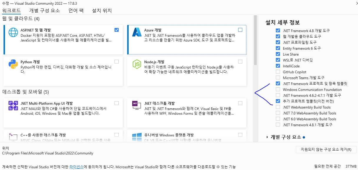 VisualStudio Installer 에서 ASP.NET 웹 개발 설치