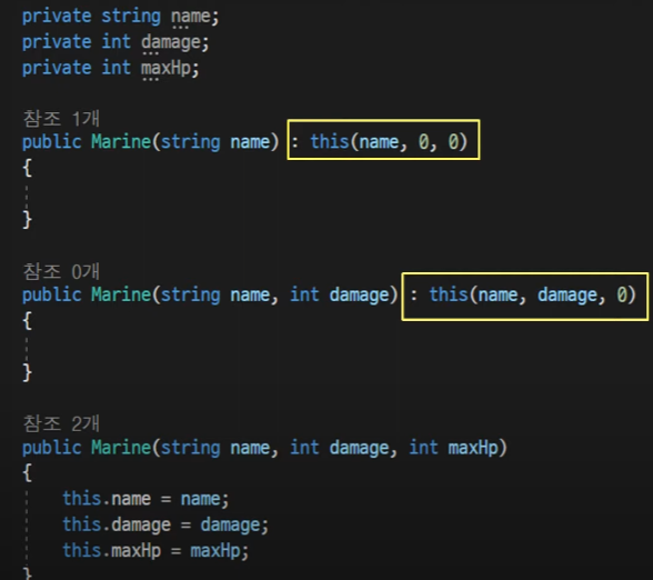 Console.WriteLine("매개변수 1개 있는 Marine 생성자, name : {0} : ", this.name);