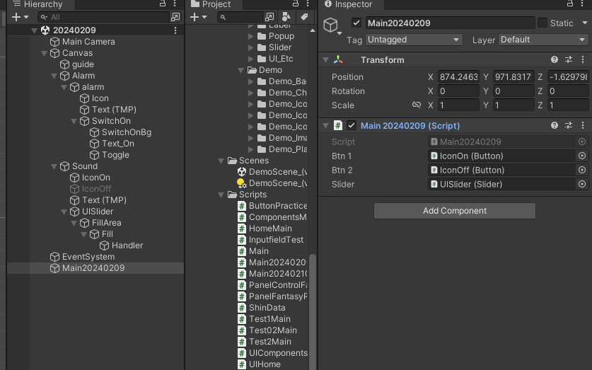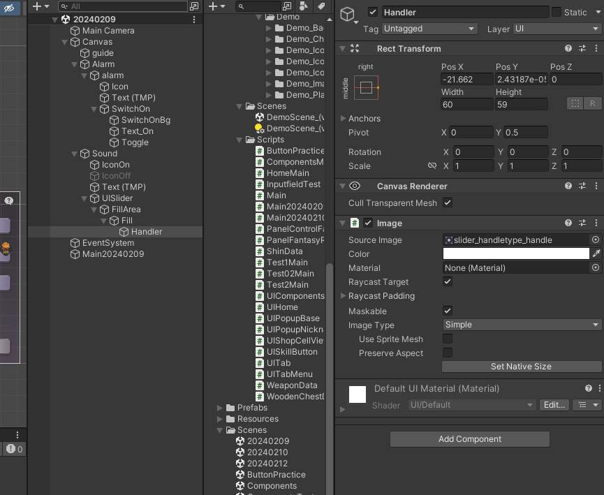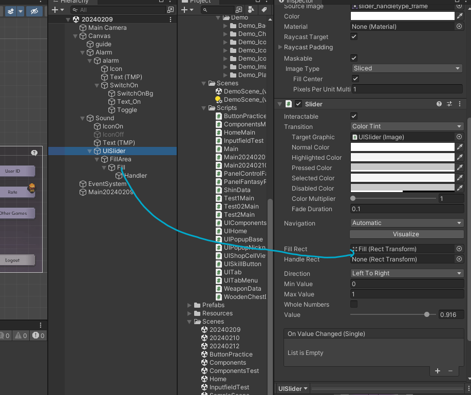 유니티의 Slider 컴포넌트를 추가하고 막대영역인 Fill을 넣어준다.