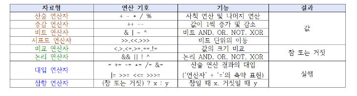 종류 : 산술 / 관계 / 논리 / 비트 /할당 / 기타 ...
