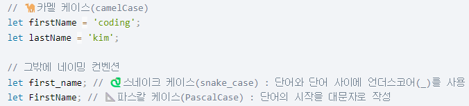 (자바스크립트는 주로 첫글자에 대문자를 쓰는 카멜 케이스를 사용)