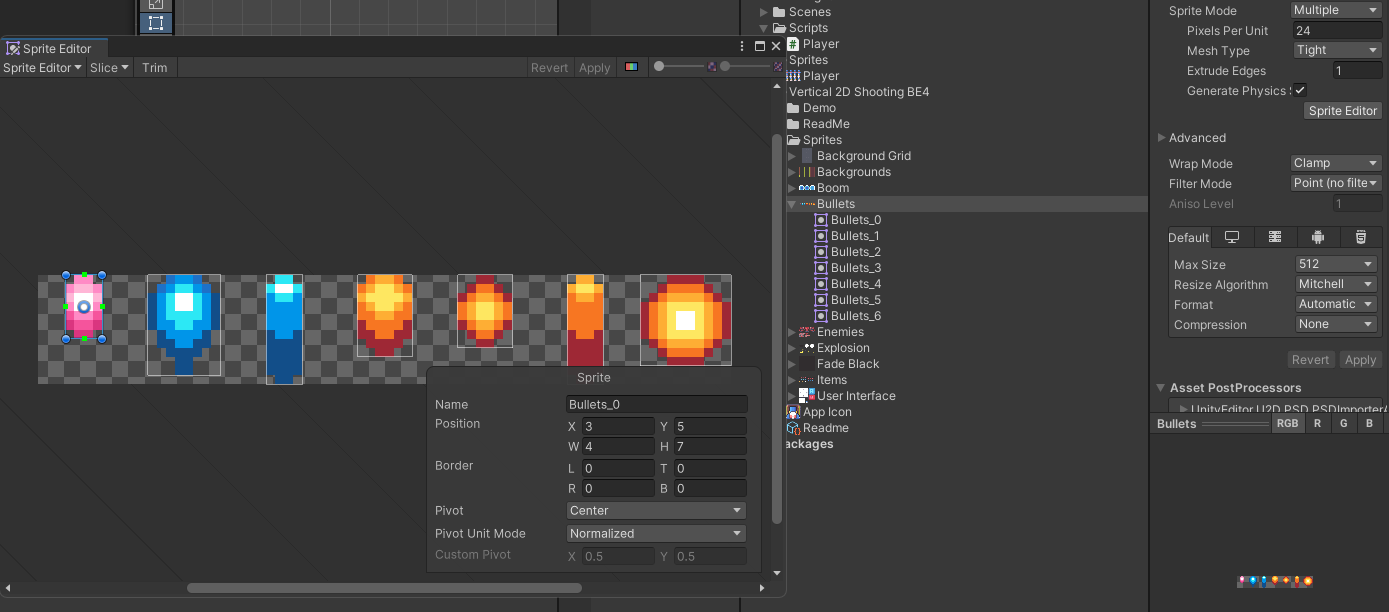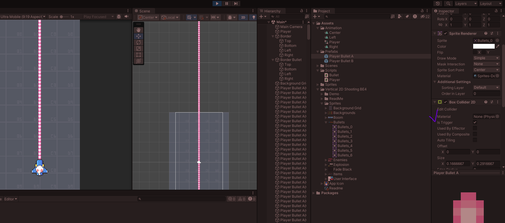 총알 A를 복사해서 만든후 스프라이트에 다른 모양을 넣은 후 콜라이더 크기 조절