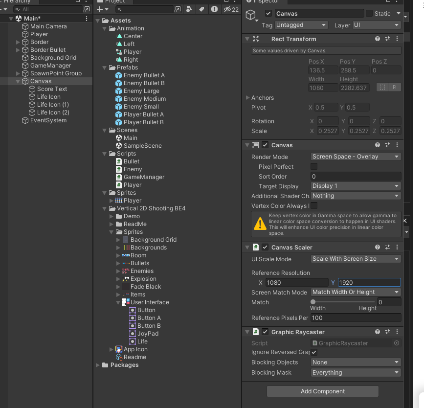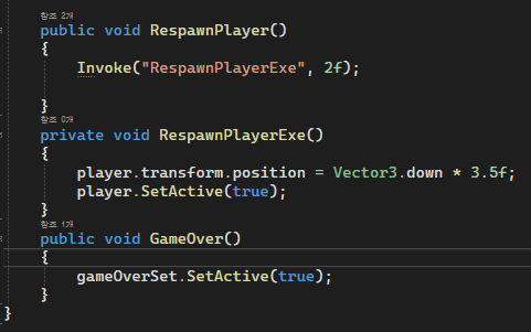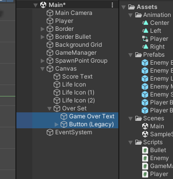 실행을 해서 죽으면 게임오버가 나오고 재시작 버튼로직을 이제 만들것이다.