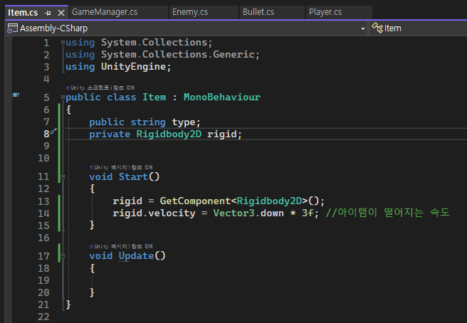 rigid.velocity = Vector3.down * 3f; //아이템이 떨어지는 속도