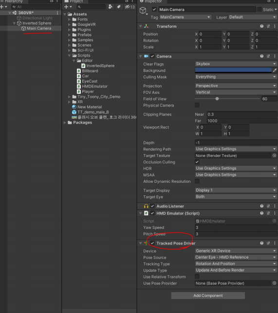 1. 앞서 만들었던 HMDEmulator를 Main Camera에 컴포넌트로 추가