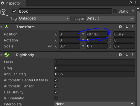 중력을 키면 책이 책상에 떨어진다.