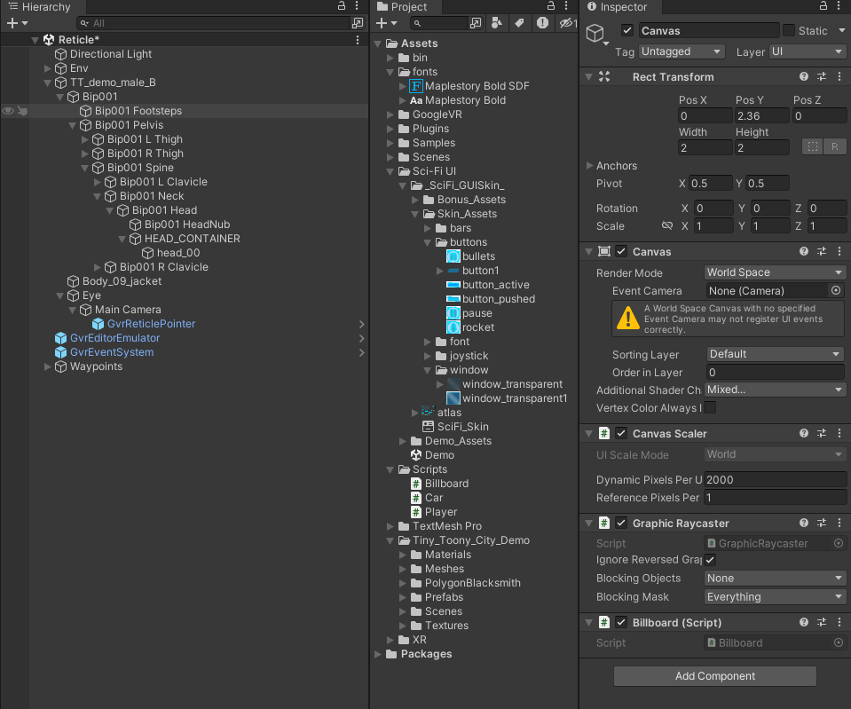 Main Camera의 GvrRecticlePointer와 GvrPointerPhysicsRaycast를 비활성화 한다.