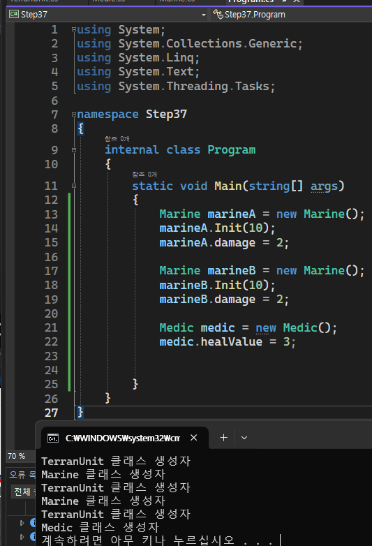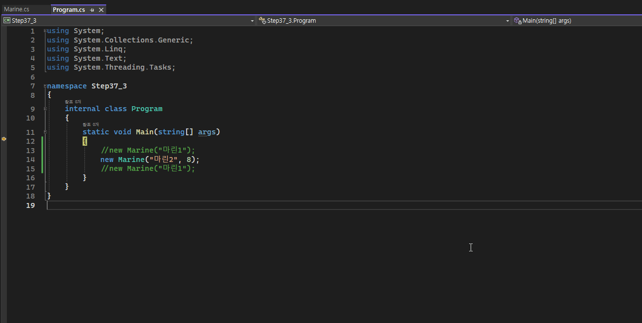 Console.WriteLine("마린의 현재 위치 : {0}, {1}", marine.position.x, marine.position.y); ;