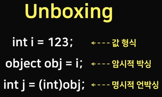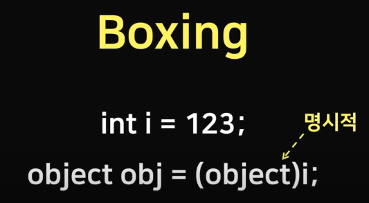 object obj = (object)i; // 명시적 박싱