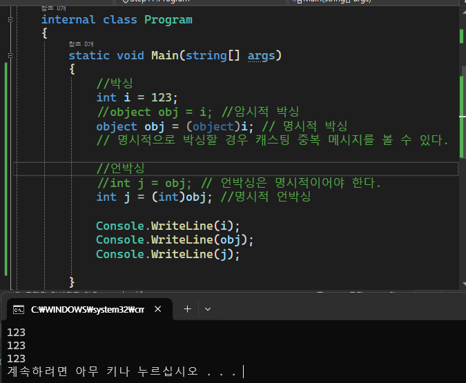 //object obj = i; //암시적 박싱