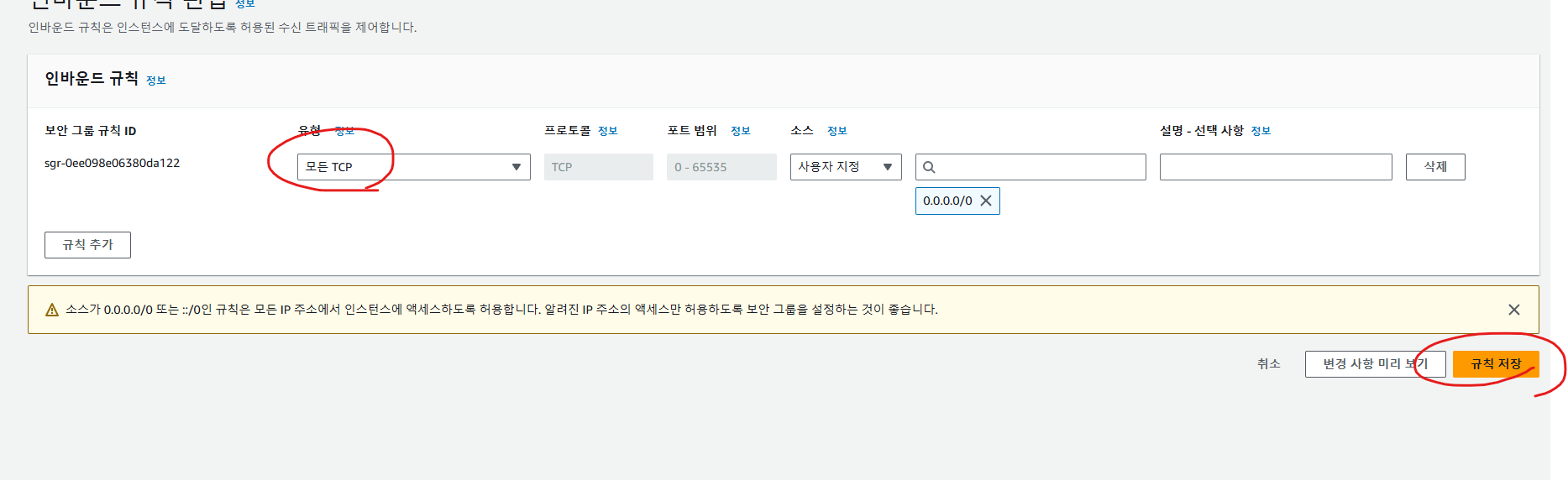 AWS에서도 방화벽을 열어주어야 한다.