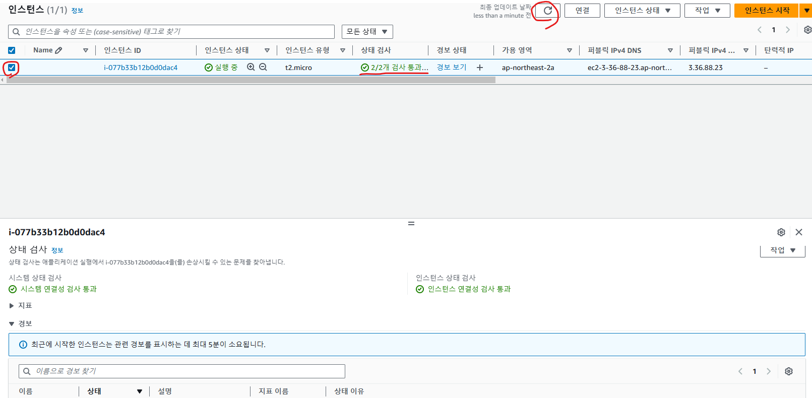 상태 검사를 하는 데 시간이 조금 걸리므로 기다렸다가 새로고침을 누르고
