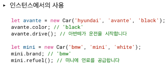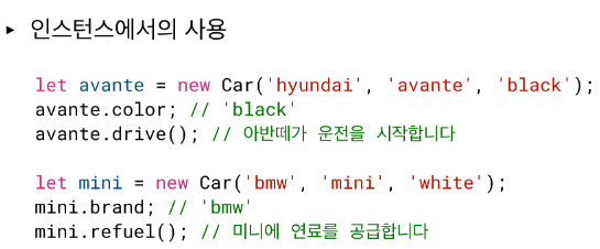 Car 클래스에 메서드를 추가하기 위해서는 Car.prototype.refuel과 같이 prototype을 이용해야 한다.