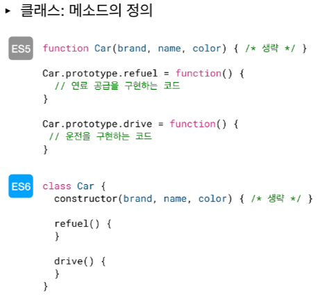 ES5는 prototype이라는 키워드를 사용해야 메서드를 정의할수 있기에.