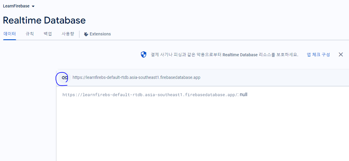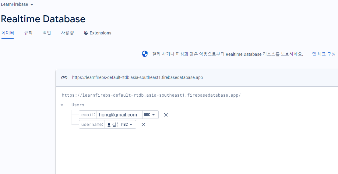 지정된 파이어베이스 주소로 데이터가 잘 들어옴을 확인할 수 있다.