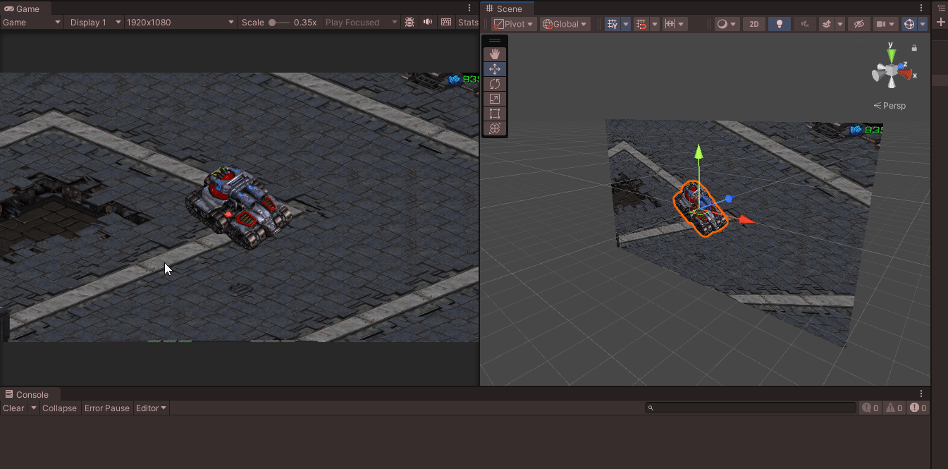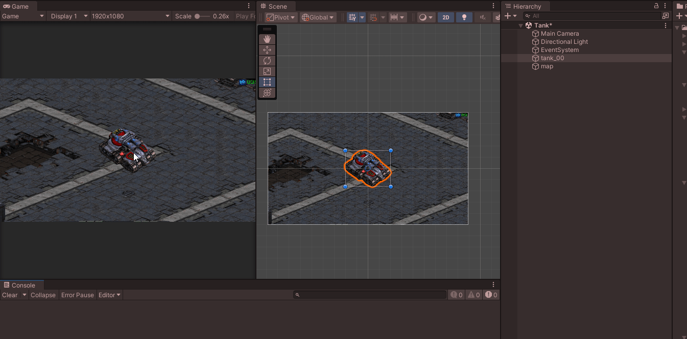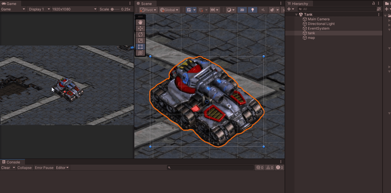 카메라는 탱크의 위치에 따라가게 Ctrl + Shift + F로 지정하였다.