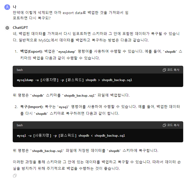 삭제가 되거나 문제가 생길 경우 Import 해서 저장된 데이터를 가져올 수 있다.