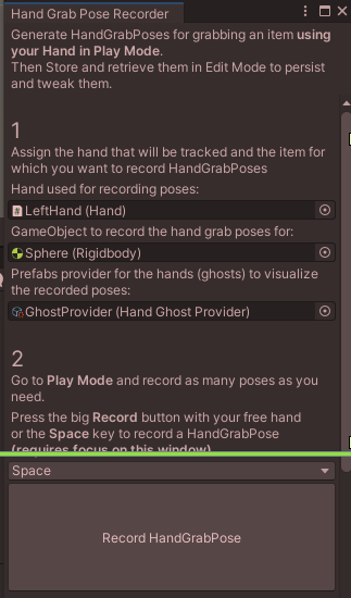 1. 구체에 손을 얹고 Record HandGrabPose를 누르면 흰색으로 스캔이 된다.