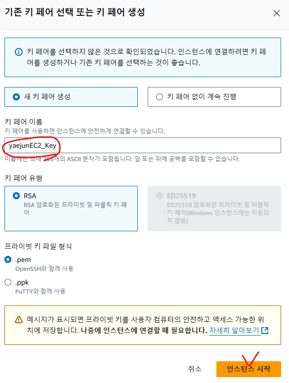 본인이 원하는 이름으로 키 이름 지정후 인스턴스 시작
