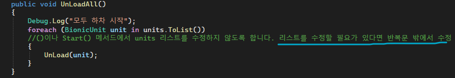 //()이나 Start() 메서드에서 units 리스트를 수정하지 않도록 합니다. 리스트를 수정할 필요가 있다면 반복문 밖에서 수정